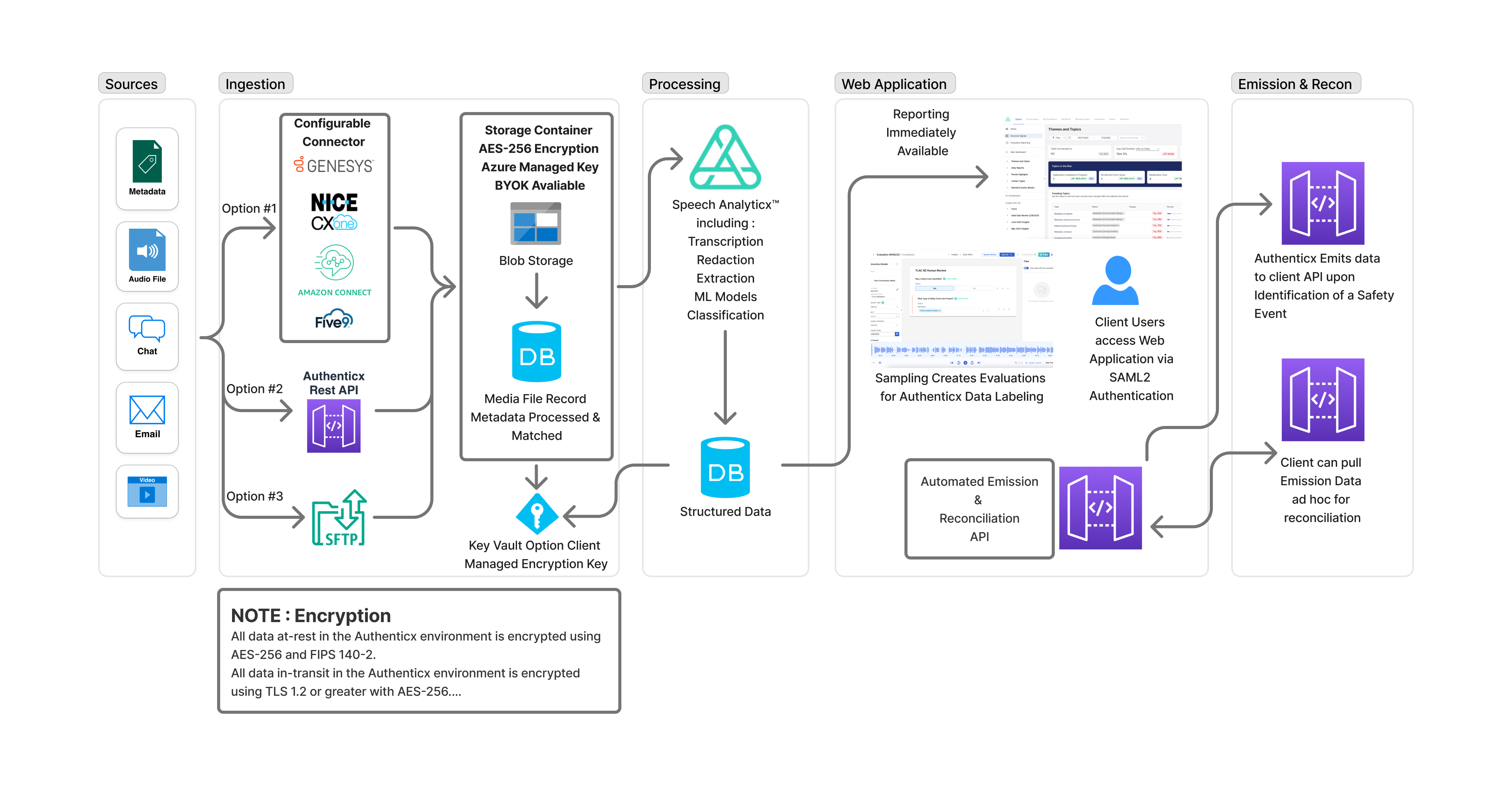 This diagram shows how customer interaction data moves through Authenticx, from source systems, through ingestion and secure storage, into AI processing, and then into the web application and optional outbound emissions.